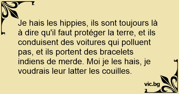 Je hais les hippies, ils sont toujours là à dire qu'il faut protéger la terre, et ils conduisent des voitures qui polluent pas, et ils portent des bracelets indiens de меrdе. Moi je les hais, je voudrais leur latter les couilles.
