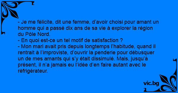 - Je me félicite, dit une femme, d’avoir choisi pour amant un homme qui a passé dix ans de sa vie à explorer la région du Pôle Nord.