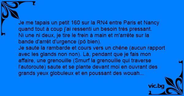 Je saute la rambarde et cours vers un chêne (aucun rapport avec les glands non non). Là, pendant que je fais mon affaire, une grenouille (Smurf la grenouille qui traverse l'autoroute) saute et se plante devant moi en ouvrant des grands yeux globuleux et en poussant des wouah admiratifs...