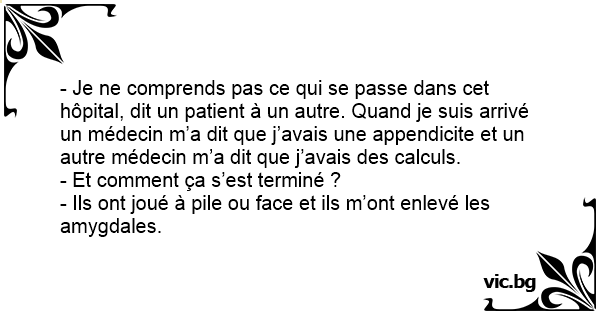 - Je ne comprends pas ce qui se passe dans cet hôpital, dit un patient à un autre. Quand je suis arrivé un médecin m’a dit que j’avais une appendicite et un autre médecin m’a dit que j’avais des calculs.