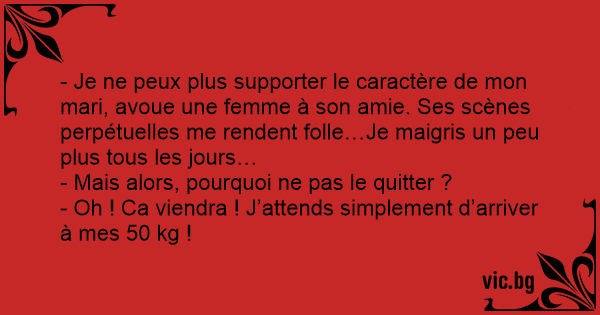 - Je ne peux plus supporter le caractère de mon mari, avoue une femme à son amie. Ses scènes perpétuelles me rendent folle…Je maigris un peu plus tous les jours…