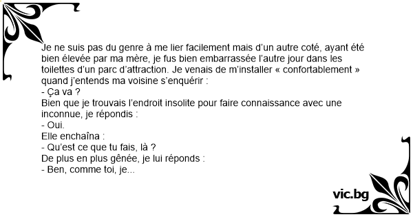 Je ne suis pas du genre à me lier facilement mais d’un autre coté, ayant été bien élevée par ma mère, je fus bien embarrassée l’autre jour dans les toilettes d’un parc d’attraction. Je venais de m’installer « confortablement » quand j’entends ma voisine s’enquérir :