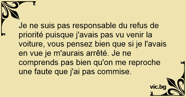 Je ne suis pas responsable du refus de priorité puisque j'avais pas vu venir la voiture, vous pensez bien que si je l'avais en vue je m'aurais arrêté. Je ne comprends pas bien qu'on me reproche une faute que j'ai pas commise.