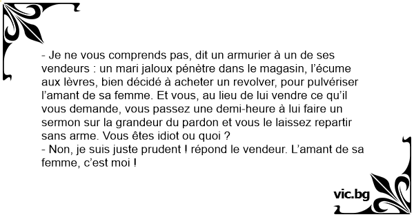 - Je ne vous comprends pas, dit un armurier à un de ses vendeurs : un mari jaloux pénètre dans le magasin, l’écume aux lèvres, bien décidé à acheter un revolver, pour pulvériser l’amant de sa femme. Et vous, au lieu de lui vendre ce qu’il vous demande, vous passez une demi-heure à lui faire un sermon sur la grandeur du pardon et vous le laissez repartir sans arme. Vous êtes idiот ou quoi ?