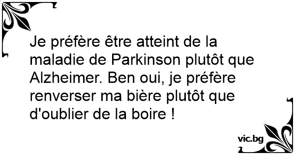 Alzheimer oder Parkison Двама пияници си говорят. Un mec demande a son pote: - Коя болест е по-добра - Алцхаймер или Паркинсон? Новинар прашува Кавадарчанец: 2 potes discutent : Deux hommes discutent dans un bar : Was ist schlimmer: Alzheimer oder Parkinson? - Ganz klar: Parkinson. Es ist besser ein Bier zu vergessen, als eines zu verschütten! Was ist Besser Parkinson oder Alzheimer? Alzheimer. Besser ein Bier vergessen statt ein Bier zu verschütten. E’ meglio avere la malattia di Alzheimer o la malattia di Parkinson? L’ Alzheimer … E’ meglio dimenticare di pagare il proprio bicchiere piuttosto che versarselo addosso! - Miért jobb az Alzheimer kór, mint a Parkinzon kór? - Inkább elfelejtem, hogy mennyit iszom, mint hogy kilöttyintsem a piát! Co jest gorsze: choroba Parkinsona czy Alzheimera? - Właściwie to wszystko jedno, czy się wyleje piwo czy zapomni gdzie postawiło? À ton avis, mieux vaut avoir la maladie d'Alzheimer ou de Parkinson? Alzheimer, car mieux vaut oublier de payer son verre que de le renverser! Καλύτερα να έχεις Parkinson παρά Alzheimer, γιατί είναι καλύτερα να χύσεις λίγο απο το ποτήρι σου παρά να ξεχάσεις να πιείς. Waarom kun je beter Alzheimer hebben dan de ziekte van Parkinson?Je kunt beter een glas bier vergeten te betalen dan om te stoten - Melyik a jobb, az Alzheimer vagy a Parkinson kór? - Az Alzheimer, mert jobb elfelejteni fizetni, mint kilötyögtetni a sört. Rozdíl mezi alzheimerem a parkinsonem: Je lepší trochu vylít, než zapomenout vypít..