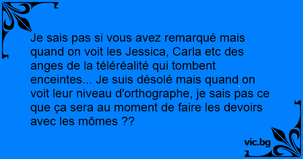 Je sais pas si vous avez remarqué mais quand on voit les Jessica, Carla etc des anges de la téléréalité qui tombent enceintes... Je suis désolé mais quand on voit leur niveau d'orthographe, je sais pas ce que ça sera au moment de faire les devoirs avec les mômes ??