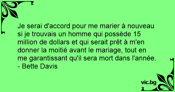 Je serai d'accord pour me marier à nouveau si je trouvais un homme qui possède 15 million de dollars et qui serait prêt à m'en donner la moitié avant le mariage, tout en me garantissant qu'il sera mort dans l'année.