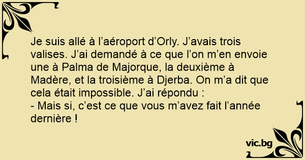 Трпе на аеродром: - Јас ќе летам за Рим, сакам овој големиов куфер да го пратите за Лондон, а овие двава помали за Минхен. - Ама г-дине, не можеме да го направиме тоа! - А како можевте минатиот... Ved bagageafleveringen i lufthavnen: "Så vil jeg gerne have denne kuffert til Venedig, denne her til Prag og den sidste til Barcelona!" "Det kan vi søreme ikke." "Hvorfor ikke. Det gjorde I da sidst!"