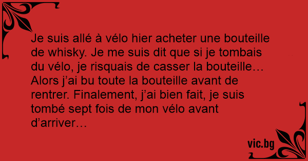 Je suis allé à vélo hier acheter une bouteille de whisky. Je me suis dit que si je tombais du vélo, je risquais de casser la bouteille… Alors j’ai bu toute la bouteille avant de rentrer. Finalement, j’ai bien fait, je suis tombé sept fois de mon vélo avant d’arriver…