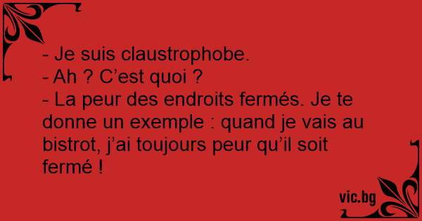 - La peur des endroits fermés. Je te donne un exemple : quand je vais au bistrot, j’ai toujours peur qu’il soit fermé !