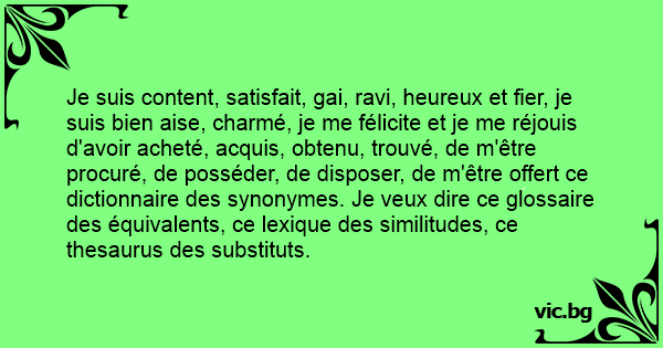 Je suis content, satisfait, gаi, ravi, heureux et fier, je suis bien aise, charmé, je me félicite et je me réjouis d'avoir acheté, acquis, obtenu, trouvé, de m'être procuré, de posséder, de disposer, de m'être offert ce dictionnaire des synonymes. Je veux dire ce glossaire des équivalents, ce lexique des similitudes, ce thesaurus des substituts.