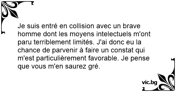 Je suis entré en collision avec un brave homme dont les moyens intelectuels m'ont paru terriblement limités. J'ai donc eu la chance de parvenir à faire un constat qui m'est particulièrement favorable. Je pense que vous m'en saurez gré.