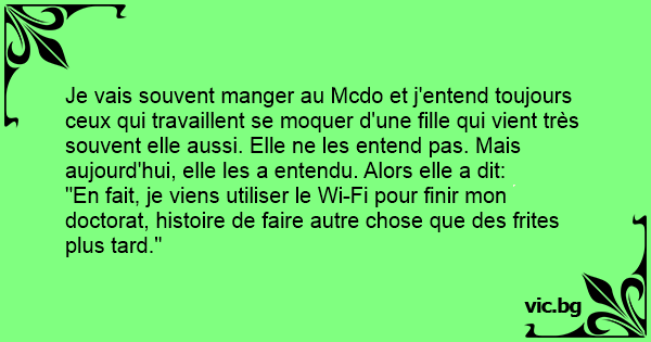 Je vais souvent manger au Mcdo et j'entend toujours ceux qui travaillent se moquer d'une fille qui vient très souvent elle aussi. Elle ne les entend pas. Mais aujourd'hui, elle les a entendu. Alors elle a dit: