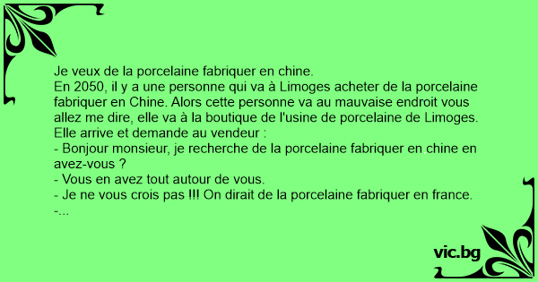 En 2050, il y a une personne qui va à Limoges acheter de la porcelaine fabriquer en Chine. Alors cette personne va au mauvaise endroit vous allez me dire, elle va à la boutique de l'usine de porcelaine de Limoges. Elle arrive et demande au vendeur :
