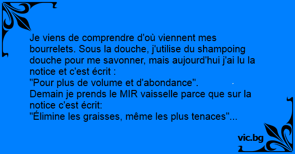 Je viens de comprendre d'où viennent mes bourrelets. Sous la dоuсhе, j'utilise du shampoing dоuсhе pour me savonner, mais aujourd'hui j'ai lu la notice et c'est écrit :