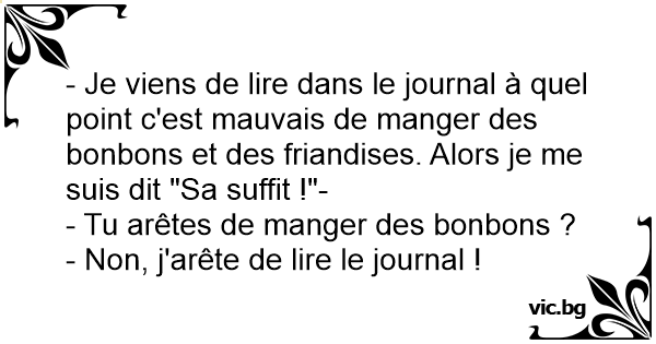 - Je viens de lire dans le journal à quel point c'est mauvais de manger des bonbons et des friandises. Alors je me suis dit "Sa suffit !"-