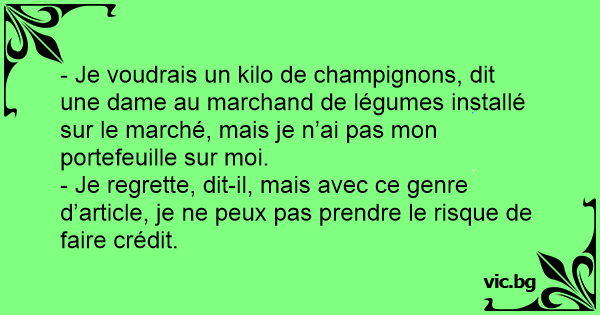 - Je voudrais un kilo de champignons, dit une dame au marchand de légumes installé sur le marché, mais je n’ai pas mon portefeuille sur moi.