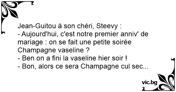 - Aujourd'hui, c'est notre premier anniv' de mariage : on se fait une petite soirée Champagne vaseline ?