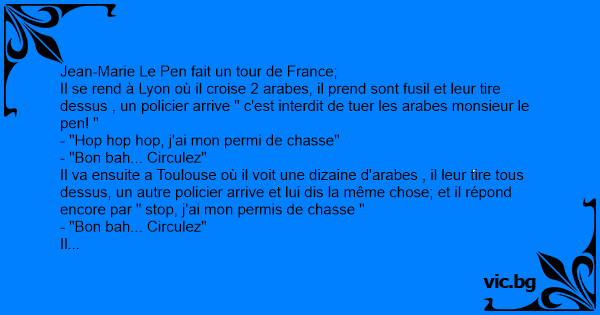 Jean-Marie Le Pen fait un tour de France; Il se rend à Lyon où il croise 2 arabes, il prend sont fusil et leur tire dessus , un policier arrive " c'est interdit de tuer les arabes monsieur le pen! " - "Hop hop hop, j'ai mon permi de chasse" - "Bon bah... Circulez" Il va ensuite a Toulouse où il voit une dizaine d'arabes , il leur tire tous dessus, un autre policier arrive et lui dis la même chose; et il répond encore par " stop, j'ai mon permis de chasse " - "Bon bah... Circulez" Il finis sont tour à Marseille en faisant un carnage, un policier lui dis" eh c'est interdit de tuer les arabes ici!" - "J'ai mon permis de chasse!" - "Ah oui sauf qu'ici c'est une réserve!"