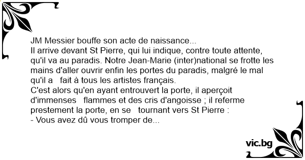 JM Messier bouffe son acte de naissance... Il arrive devant St Pierre, qui lui indique, contre toute attente, qu'il va au paradis. Notre Jean-Marie (inter)national se frotte les mains d'aller ouvrir enfin les portes du paradis, malgré le mal qu'il a fait à tous les artistes français. C'est alors qu'en ayant entrouvert la porte, il aperçoit d'immenses flammes et des cris d'angoisse ; il referme prestement la porte, en se tournant vers St Pierre : - Vous avez dû vous tromper de porte ! Ca ressemble plutôt à l'enfer ! Et St Pierre de lui répondre : - Ah, vous ne saviez pas ? On a fusionné...