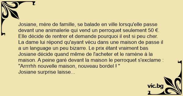 Une femme va acheter un perroquet. Les prix sont de 100€, 200€ et 15€. Elle demande pourquoi le dernier et si peu chère par rapport au autres. - « C'est parce qu'il vivait dans un bordel » lui...