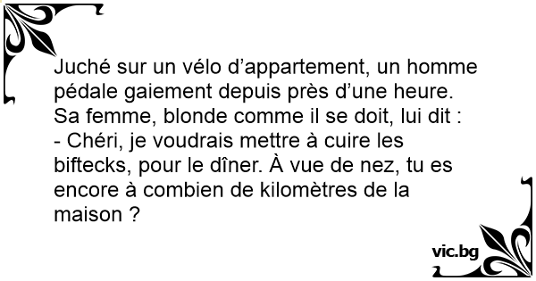 Juché sur un vélo d’appartement, un homme pédale gaiement depuis près d’une heure. Sa femme, blonde comme il se doit, lui dit :