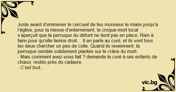 Juste avant d’emmener le cercueil de feu monsieur le maire jusqu’à l’église, pour la messe d’enterrement, le croque-mort local s’aperçoit que la perruque du défunt ne tient pas en place. Rien à faire pour qu’elle tienne droit… Il en parle au curé, et ils vont tous les deux chercher un peu de colle. Quand ils reviennent, la perruque semble solidement plantée sur le crâne du mort.