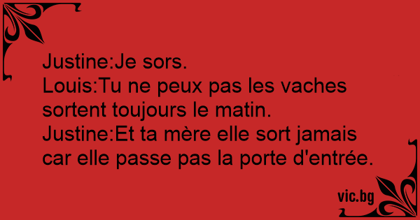 Justine:Et ta mère elle sort jamais car elle passe pas la porte d'entrée.