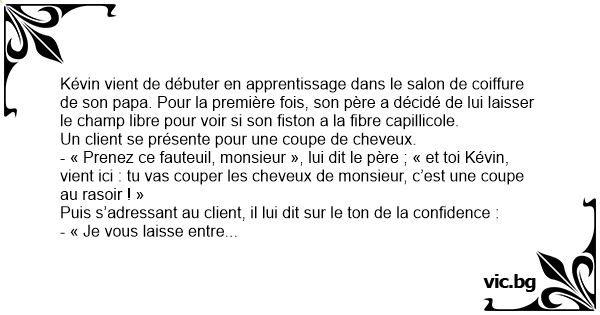 - « Je vous laisse entre les mains de mon fils ; ça sera sa première coupe, mais rassurez-vous, je le surveille ! »