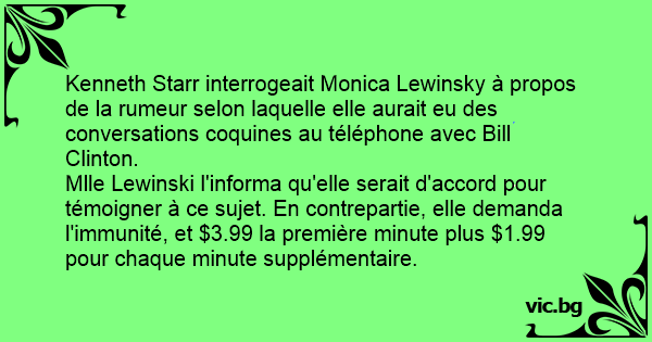 Mlle Lewinski l'informa qu'elle serait d'accord pour témoigner à ce sujet. En contrepartie, elle demanda l'immunité, et $3.99 la première minute plus $1.99 pour chaque minute supplémentaire.