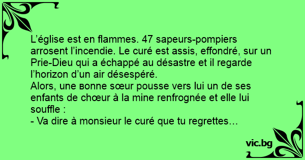 L’église est en flammes. 47 sapeurs-pompiers arrosent l’incendie. Le curé est assis, effondré, sur un Prie-Dieu qui a échappé au désastre et il regarde l’horizon d’un air désespéré.