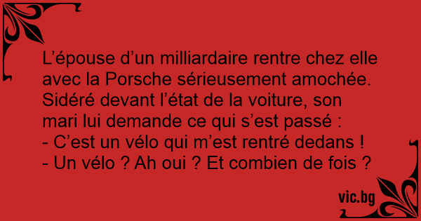 L’épouse d’un milliardaire rentre chez elle avec la Porsche sérieusement amochée. Sidéré devant l’état de la voiture, son mari lui demande ce qui s’est passé :