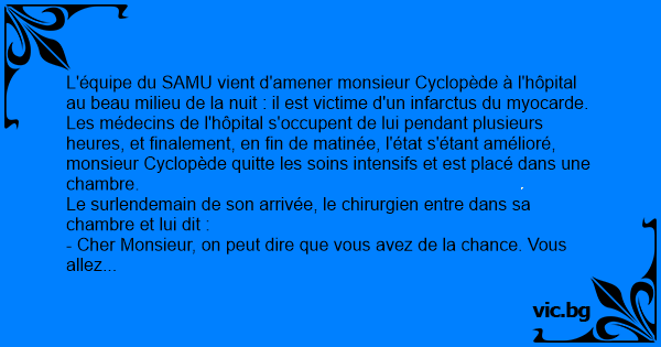 Les médecins de l'hôpital s'occupent de lui pendant plusieurs heures, et finalement, en fin de matinée, l'état s'étant amélioré, monsieur Cyclopède quitte les soins intensifs et est placé dans une chambre.