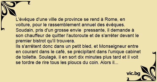 L'évêque d'une ville de province se rend à Rome, en voiture, pour le rassemblement annuel des évêques. Soudain, pris d'un grosse envie  pressante, il demande à son chauffeur de quitter l'autoroute et de s'arrêter devant le premier bistrot qu'il trouvera.