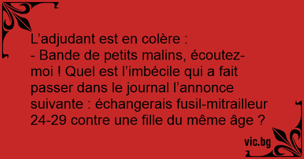 - Bande de petits malins, écoutez-moi ! Quel est l’imbécile qui a fait passer dans le journal l’annonce suivante : échangerais fusil-mitrailleur 24-29 contre une fille du même âge ?