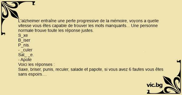 L'alzheimer entraîne une perte progressive de la mémoire, voyons a quelle vitesse vous êtes capable de trouver les mots manquants... Une personne normale trouve toute les réponse justes.