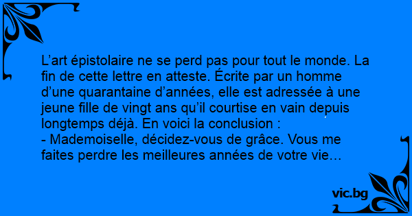 L’art épistolaire ne se perd pas pour tout le monde. La fin de cette lettre en atteste. Écrite par un homme d’une quarantaine d’années, elle est adressée à une jeune fille de vingt ans qu’il courtise en vain depuis longtemps déjà. En voici la conclusion :