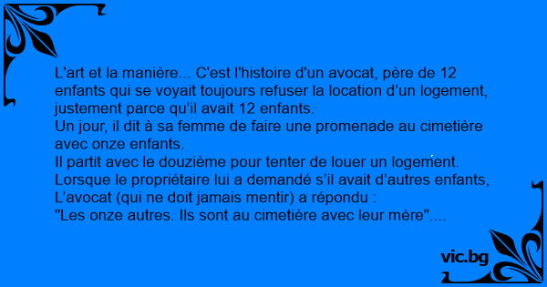 L'art et la manière... C'est l'histoire d'un avocat, père de 12 enfants qui se voyait toujours refuser la location d’un logement, justement parce qu’il avait 12 enfants.