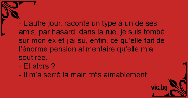 - L’autre jour, raconte un type à un de ses amis, par hasard, dans la rue, je suis tombé sur mon ex et j’ai su, enfin, ce qu’elle fait de l’énorme pension alimentaire qu’elle m’a soutirée.