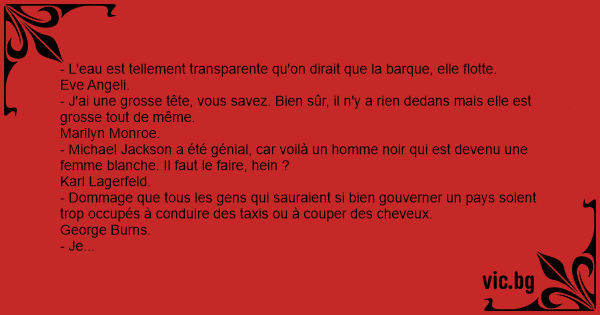 - L'eau est tellement transparente qu'on dirait que la barque, elle flotte. Eve Angeli. - J'ai une grosse tête, vous savez. Bien sûr, il n'y a rien dedans mais elle est grosse tout de même. Marilyn Monroe. - Michael Jackson a été génial, car voilà un homme noir qui est devenu une femme blanche. Il faut le faire, hein ? Karl Lagerfeld. - Dommage que tous les gens qui sauraient si bien gouverner un pays soient trop occupés à conduire des taxis ou à couper des cheveux. George Burns. - Je vivais de privations, et encore, pas tous les jours. Alexandre Breffort