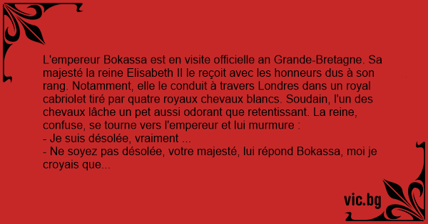 L'empereur Bokassa est en visite officielle an Grande-Bretagne. Sa majesté la reine Elisabeth II le reçoit avec les honneurs dus à son rang. Notamment, elle le conduit à travers Londres dans un royal cabriolet tiré par quatre royaux chevaux blancs. Soudain, l'un des chevaux lâche un pet aussi odorant que retentissant. La reine, confuse, se tourne vers l'empereur et lui murmure :