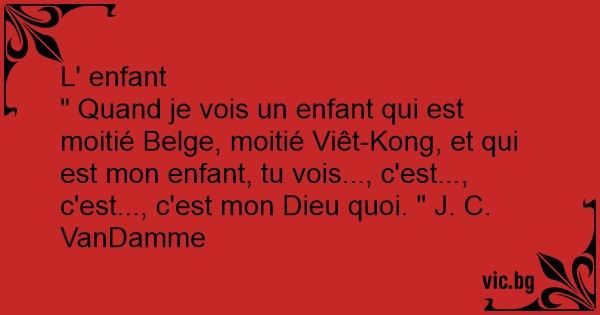 " Quand je vois un enfant qui est moitié Belge, moitié Viêt-Kong, et qui est mon enfant, tu vois..., c'est..., c'est..., c'est mon Dieu quoi. " J. C. VanDamme