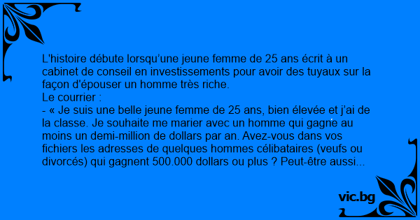 - « Je suis une belle jeune femme de 25 ans, bien élevée et j’ai de la classe. Je souhaite me marier avec un homme qui gagne au moins un demi-million de dollars par an. Avez-vous dans vos fichiers les adresses de quelques hommes célibataires (veufs ou divorcés) qui gagnent 500.000 dollars ou plus ? Peut-être aussi que des épouses d’hommes riches peuvent me donner quelques conseils ?