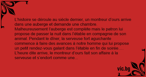 L’histoire se déroule au siècle dernier, un montreur d’ours arrive dans une auberge et demande une chambre. Malheureusement l’auberge est complète mais le patron lui propose de passer la nuit dans l’étable en compagnie de son animal. Pendant le dîner, la serveuse fort aguichante commence à faire des avances à notre homme qui lui propose un petit rendez-vous galant dans l’étable en fin de soirée….
