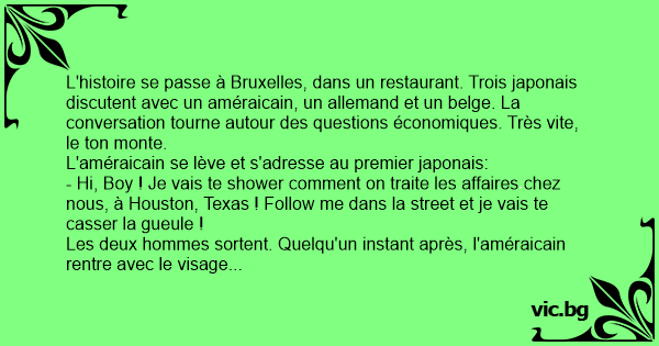 Les deux hommes s'éclipsent. Trente secondes plus таrd, le japonais rentre avec le tronche délabrée, couvert de sang. Le belge suit et dit en souriant:
