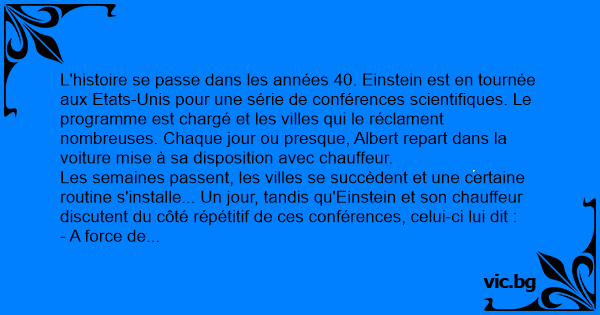 Le lendemain, la salle municipale est comble. Einstein s'installe au fond, debout, près de la porte comme le fait son chauffeur habituellement. La conférence commence et l'imposteur ne s'en sort pas mal du tout. Personne, parmi l'assistance, ne semble détecter la supercherie. A la fin de la conférence toutefois, un homme se lève et pose une question très technique sur la théorie d'Einstein. Une question à laquelle évidemment, le chauffeur est bien en peine de répondre...