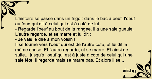 Il se tourne vers l'oeuf qui est de l'autre coté, et lui dit la même chose. Et l'autre regarde, et se marre. Et ainsi de suite... jusqu'à l'oeuf qui est à juste à coté de celui qui une sale tête. Il regarde mais se marre pas. Et alors il se retourne et répond :