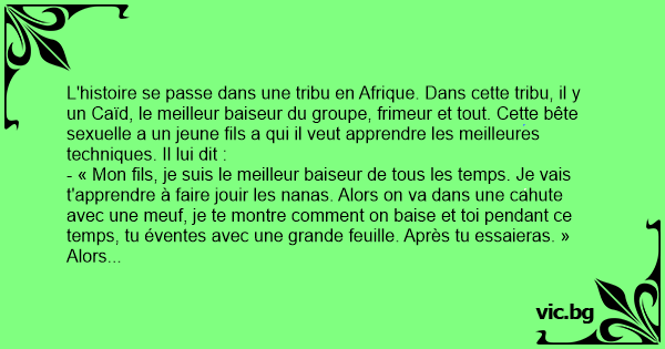 L'histoire se passe dans une tribu en Afrique. Dans cette tribu, il y un Caïd, le meilleur baiseur du groupe, frimeur et tout. Cette bête sexuelle a un jeune fils a qui il veut apprendre les meilleures techniques. Il lui dit :