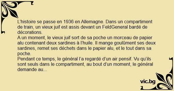 L’histoire se passe en 1936 en Allemagne. Dans un compartiment de train, un vieux juif est assis devant un FeldGeneral bardé de décorations.