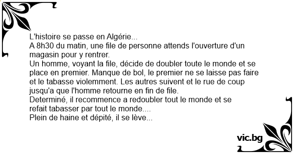 Un homme, voyant la file, décide de doubler toute le monde et se place en premier. Manque de bol, le premier ne se laisse pas faire et le tabasse violemment. Les autres suivent et le rue de coup jusqu'a que l'homme retourne en fin de file.
